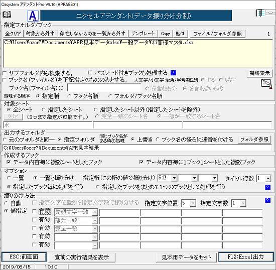 ![]() 機能 指定桁でブック/シートを分離して作成します。 ![]() 指定フォルダ/ブック 詳細はここをクリック ・パスワード付きブックも処理する チェックを入れるとパスワード付きブックの処理時にパスワードを入力する事画面が表示されます。 詳細はこちらをご参照下さい。 出力するフォルダ 詳細はここをクリック 作成するブック □データ内容毎に複数シートとしたブック 分離された内容毎のシートが作成されます。 ブックの名前は ブック_振分分割.xlsx のようにファイル名の後に_振分分割が付加されます。 値指定の場合は、値に該当しないデータは「その他」のシートとして作成されます。 □データ内容毎に1ブック1シートとした複数のブック 下記のようにデータ内容毎に1ブック1シートとした複数のブックが作成されます。 ブック_奈良県.xlsx ブック_京都府.xlsx ブック_滋賀県.xlsx ブック_大阪府.xlsx ブック_三重県.xlsx 値指定の場合は、値に該当しないデータは「その他」がつきます。 ブック_その他.xlsx オプション ・一覧 振分結果のデータ件数を一覧表示します ブックは作成されません。一覧(振り分け毎の件数付き)が出力されるだけとなりますが、高速に処理を行います。 ・一覧と振り分け 一覧を出すとともに、振り分けたファイルを作成します。 yyyyyyy_振り分け値.xxx yyyyはファイル名 xxxはブックの拡張子 例1)データ内容毎に複数シートとしたブックの場合 テストデータ.xlsx 自動の場合 値指定の場合 テストデータ_振分分割.xlsx テストデータ_振分分割.xlsx 例2)データ内容毎に1ブックとした複数ブックの場合 テストデータ.xlsx 自動の場合 値指定の場合 テストデータ_大阪.xlsx テストデータ_グループ1.xlsx テストデータ_東京.xlsx テストデータ_グループ2.xlsx テストデータ_その他.xlsx 値指定の場合は、値に該当しないデータのファイルその他として 作成されます。 ○指定したブック毎に処理を行う。 これを指定した場合はブック毎に処理を行います。 ○指定したブックをまとめて1つのブックとして処理を行う。 指定されたブックを1つのブックとして処理を行います。 ブック名は、指定されているブックメイトは無関係に データ振り分け として作成されます。 自動の場合 値指定の場合 データ振り分け_振分分割.xlsx データ振り分け_グループ1.xlsx データ振り分け_グループ2.xlsx データ振り分け_その他.xlsx ・指定桁(この桁で振り分け) 振り分けたい値のある桁を指定します。 複数指定した場合は、結合された文字列で振り分けを行います。 例) 桁A B C 大阪府 大阪市 西区 このような場合 大阪府大阪市西区 として振り分けを行います。 振り分け方法 自動 指定した桁のデータでグループ分けして振り分けます。 指定文字位置から指定文字数で振り分けるにチェックを入れない場合は、指定桁全体の値で振り分けます。 値指定 完全一致 指定した文字と完全に一致した文字で振り分けます 先頭文字一致 指定した文字とデータの先頭が同じになるデータで振り分けます 部分文字一致 指定した文字がデータの一部に含まれるデータで振り分けます 振り分け例 指定桁のデータ 1214001 1314001 2424002 1214001 1314001 2424002 1214001 2434002 自動:指定文字位置から指定文字数で振り分けるにチェックを入れない場合 1214001 3件 1314002 2件 2424002 3件 自動:指定文字位置から指定文字数で振り分けるにチェックを入れた場合 指定文字位置 1 指定文字数 2 の場合 指定文字位置 5 指定文字数 3 の場合 12 3件 001 5件 13 2件 002 3件 24 3件 値指定:完全一致 先頭文字一致 値 2 完全一致 値 1214001 部分一致 値 3 2 3件 1214001 3件 3 2件 その他 5件 その他 5件 その他 6件 直前の実行結果を表示 クリックすると、直前に実行し作成されたブックを表示します。 |