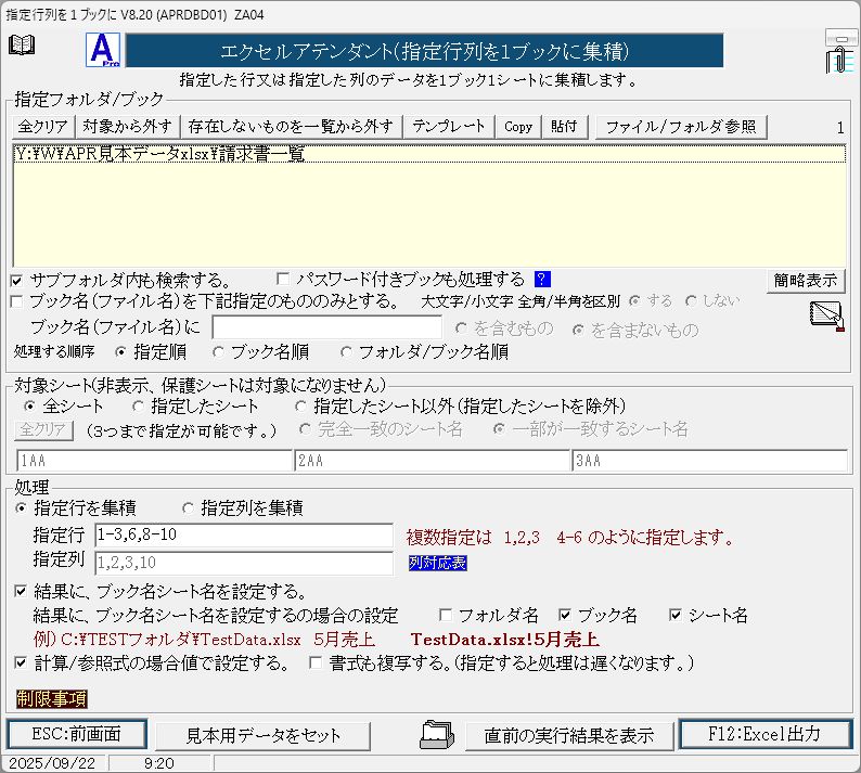 ![]() 機能 指定したフォルダにある全ての Excelブックに対し、指定した行または列を1つのシートに集積します。 ![]() ○簡略表示で内容確認。(詳細はここをクリック) ブックを指定する場合、その内容をExcelを起動することなく、確認する事ができます。 処理 ・指定行を集積 指定した行を集積します。 複数列を指定する場合は、1,2,3 のように , で区切ります。 連続した行の指定は 1-3 のように - で指定します。 ・指定列を集積 指定した列を集積します。 複数列を指定する場合は、1,2,3 のように , で区切ります。 連続した列の指定は 1-3 のように - で指定します。 結果にブック名シート名を設定する。 フォルダ名/ブック名/シート名を結果に設定します。 計算/参照式の場合値で設定する。 計算/参照式の場合に集積すると計算式/参照式のアドレスがずれてしまいます。これを防ぐため値で設定します。 書式も設定する。 これにチェックを入れると書式も複写されます。大量の行や列となる場合は極端に遅くなりますので、大量データになる場合は指定しないで下さい。 集積行/列数に関する制限事項 集積結果を格納するブック(対象となるブックではありません。)について、 Excel2003以前 約65,500行以内 約255列以内 それ以降のExcel 約80万行以内 約15,000列以内 となります。 ※直前の実行結果を表示 クリックすると、直前に実行し作成されたブックを表示します。 |