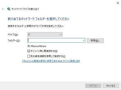 ドライブ文字を選択します。(例えば Z) フォルダの参照ボタンをクリックし、ネットワークのフォルダを選択します。 ただし、サーバ側が一覧煮出さない設定の場合は一覧には表示されません。
