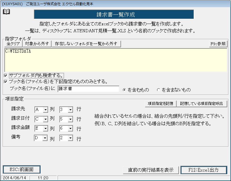 指定フォルダ以下にあるEXCELブックで作成された請求書の項目一覧を作成します。
